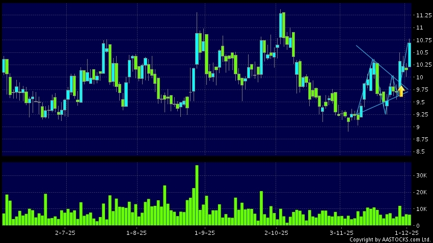 三角形向上突破是指股價的波幅漸漸收窄,在圖表上形成三角形般的狀態。股價在三角形的末端向上突破,形成上升趨勢,技術走勢向好。(港股報價延遲最少十五分鐘。沽空資料截至 2025-12-03 16:25。)