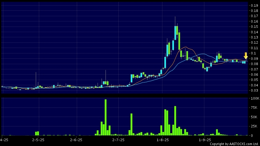 勝利管道(01080.HK) 0.000 (0.000%) 10天移動平均線跌穿20天移動平均線,出現死亡交叉。現價報0.085,無升跌,成交量99.45萬股,成交額8.57萬。