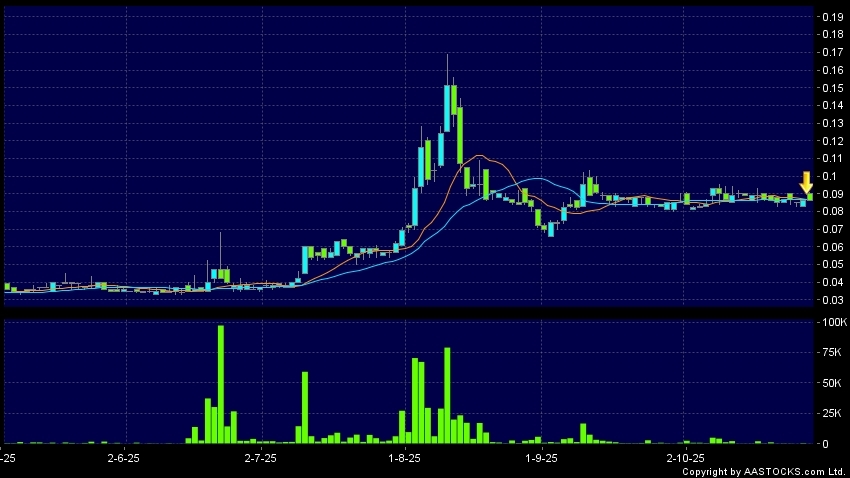勝利管道(01080.HK) +0.001 (+1.111%) 10天移動平均線跌穿20天移動平均線,出現死亡交叉。現價報0.086,無升跌,成交量12.45萬股,成交額1.10萬。