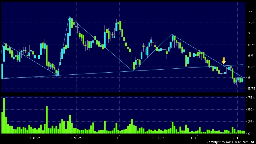 頭肩頂是典型的沽出訊號,當股價跌穿支持線(頸線)時,跌勢確認股價將持續下跌,技術走勢偏軟。(港股報價延遲最少十五分鐘。沽空資料截至 2026-01-08 12:25。)