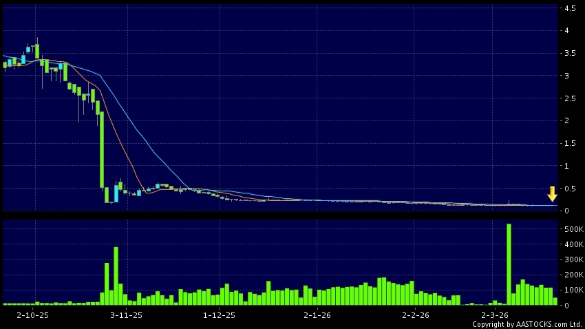 能源及能量環球(01142.HK) 0.000 (0.000%) 沽空 $3.29萬; 比率 0.562% 10天移動平均線跌穿20天移動平均線,出現死亡交叉。現價報0.119,無升跌,成交量5.00千萬股,成交額5.95百萬。