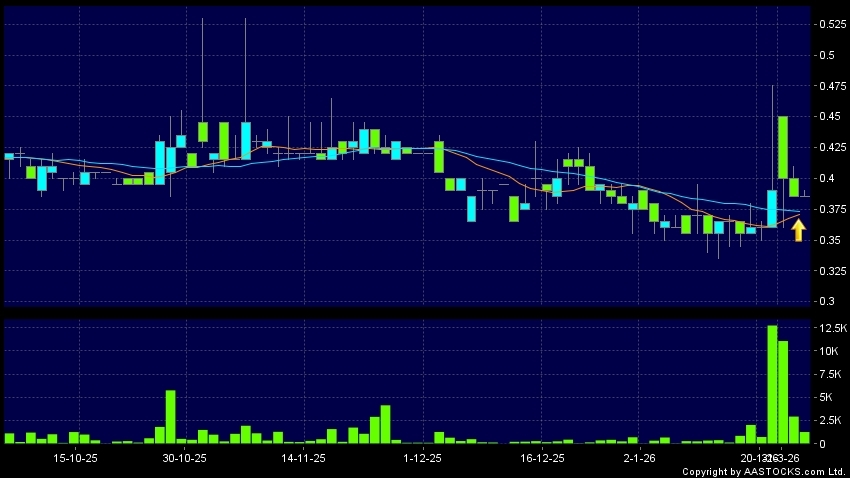 中國儲能科技發展(01143.HK) 0.000 (0.000%) 10天移動平均線升穿20天移動平均線,出現黃金交叉。現價報0.385,無升跌,成交量1.27百萬股,成交額49.00萬。