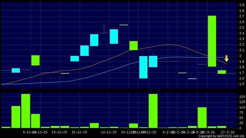 死亡交叉是一個利淡信號,指股價的短期移動平均線跌穿長期移動平均線,例如50天線跌穿250天線,在圖表上構成交叉的形狀。股價通常會下跌形成一個下降趨勢,技術走勢偏軟。(港股報價延遲最少十五分鐘。)