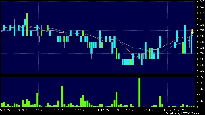 宏安地產(01243.HK) +0.002 (+6.061%) 10天移動平均線跌穿20天移動平均線,出現死亡交叉。現價報0.035,下跌7.895%,成交量38.80萬股,成交額1.36萬。