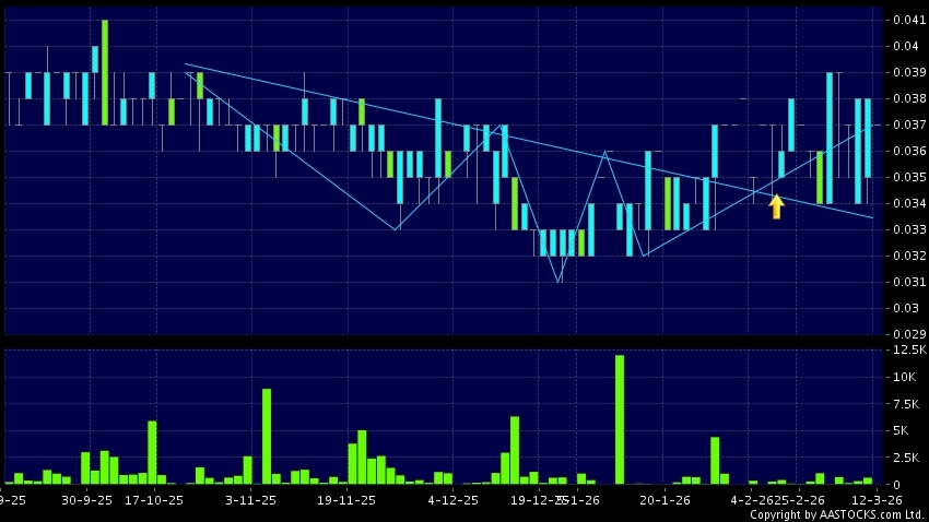 宏安地產(01243.HK) +0.002 (+6.061%) 呈現頭肩底向上突破,股價升穿頸線。現價報0.037,無升跌,成交量0.00股,成交額0.00。