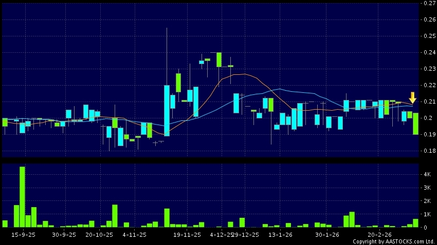 NIRAKU(01245.HK) 0.000 (0.000%) 10天移動平均線跌穿20天移動平均線,出現死亡交叉。現價報0.190,下跌5.000%,成交量63.60萬股,成交額12.11萬。
