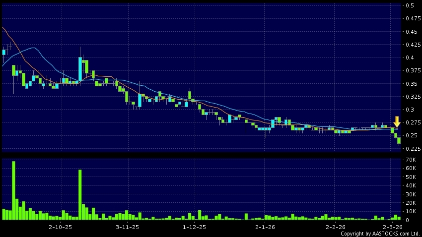 中國天瑞水泥(01252.HK) 0.000 (0.000%) 10天移動平均線跌穿20天移動平均線,出現死亡交叉。現價報0.235,下跌4.472%,成交量3.67百萬股,成交額86.86萬。