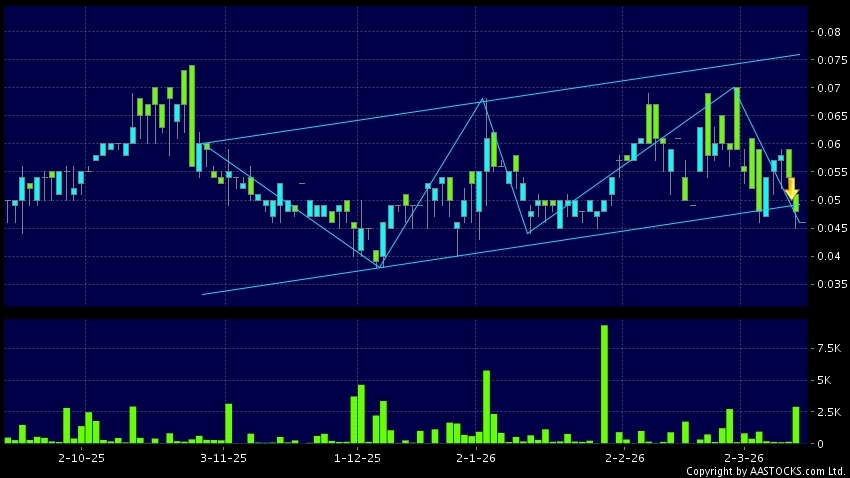 首控集團(01269.HK) -0.003 (-6.000%) 呈現區域下軌突破。現價報0.046,下跌4.167%,成交量0.00股,成交額0.00。