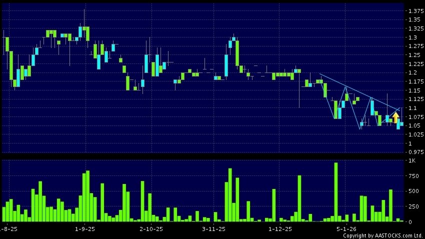 大唐環境(01272.HK) +0.040 (+3.150%) 呈現頭肩底向上突破,股價升穿頸線。現價報1.060,下跌0.935%,成交量2.10萬股,成交額2.27萬。