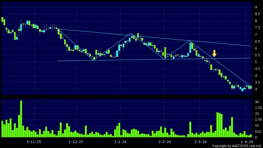 三角形向下突破是指股價的波幅漸漸收窄,在圖表上形成三角形般的狀態。股價在三角形的末端向下突破,下跌趨勢形成,技術走勢偏軟。(港股報價延遲最少十五分鐘。)