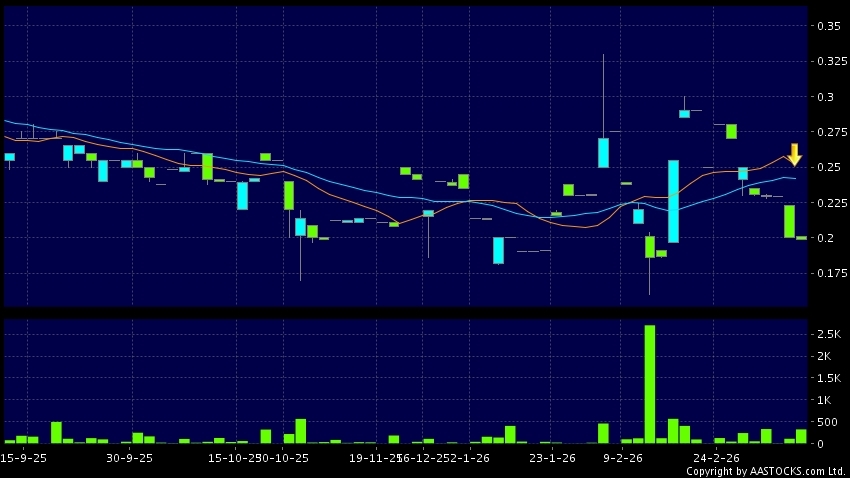 匯力資源(01303.HK) 0.000 (0.000%) 10天移動平均線跌穿20天移動平均線,出現死亡交叉。現價報0.199,下跌0.500%,成交量32.40萬股,成交額6.46萬。