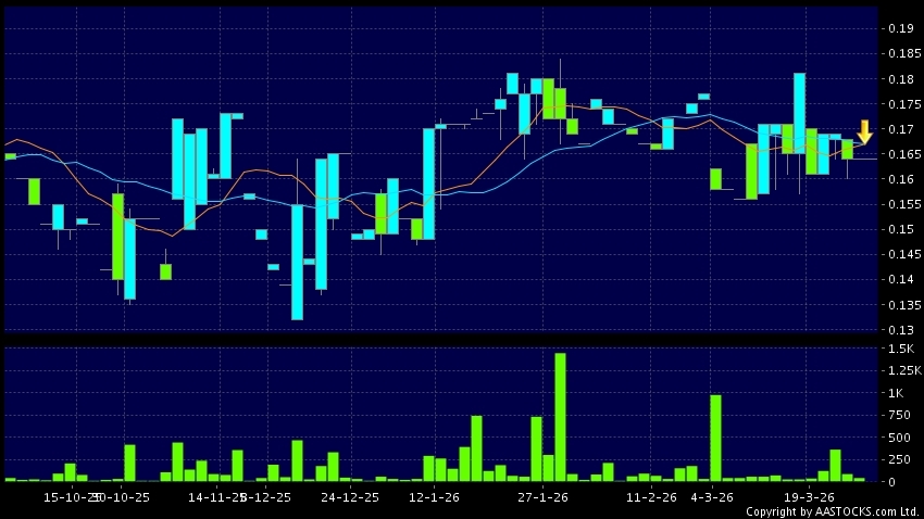 強泰環保(01395.HK) +0.003 (+1.863%) 10天移動平均線跌穿20天移動平均線,出現死亡交叉。現價報0.164,無升跌,成交量0.00股,成交額0.00。