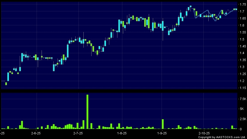 雋思集團(01412.HK)  -0.010 (-0.581%)   呈現三重底突破向上。現價報1.720,上升0.585%,成交量14.80萬股,成交額25.34萬。