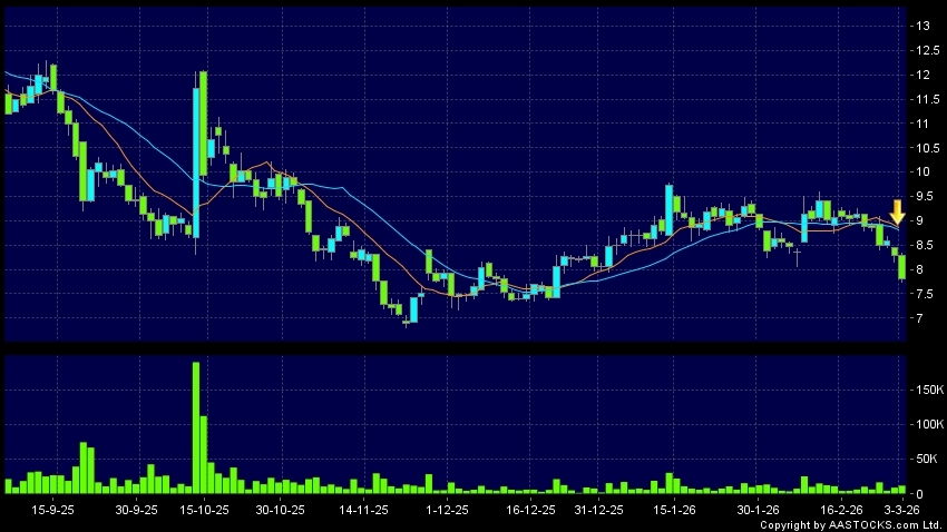 耀才證券金融(01428.HK) -0.550 (-4.044%) 沽空 $6.75千萬; 比率 3.815% 10天移動平均線跌穿20天移動平均線,出現死亡交叉。現價報7.850,下跌5.308%,成交量1.22千萬股,成交額9.63千萬。