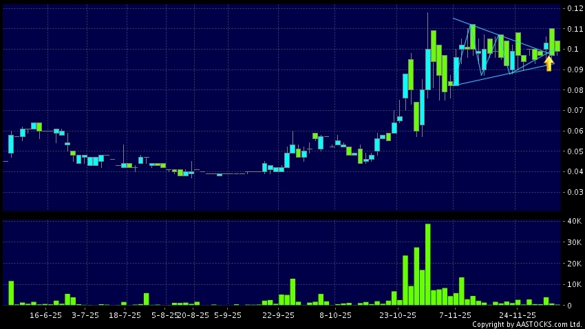 天任集團(01429.HK) 0.000 (0.000%) 呈現三角形向上突破。現價報0.099,上升2.062%,成交量34.40萬股,成交額3.35萬。