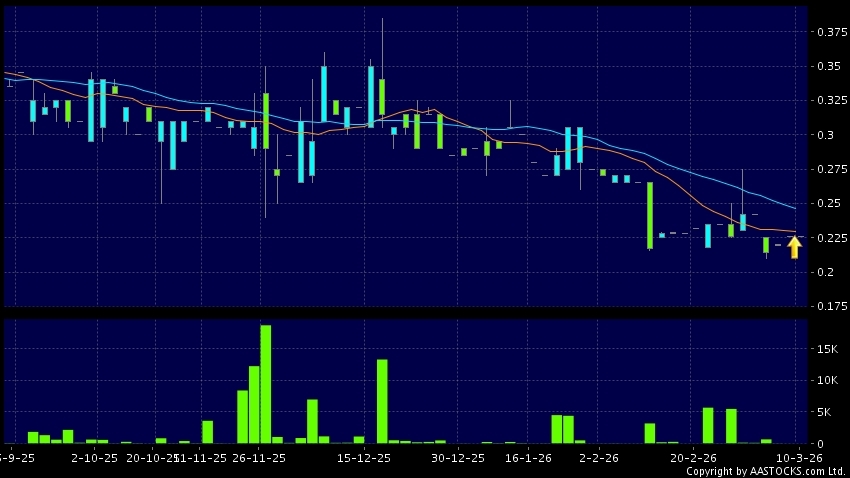 揚科集團(01460.HK) +0.001 (+0.474%) 10天移動平均線升穿20天移動平均線,出現黃金交叉。現價報0.226,無升跌,成交量0.00股,成交額0.00。