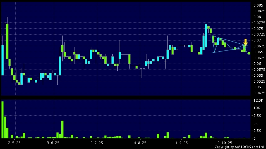 三角形向下突破是指股價的波幅漸漸收窄,在圖表上形成三角形般的狀態。股價在三角形的末端向下突破,下跌趨勢形成,技術走勢偏軟。(港股報價延遲最少十五分鐘。)