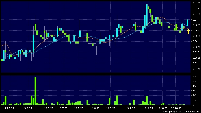 生興控股(01472.HK) -0.002 (-2.899%) 10天移動平均線升穿20天移動平均線,出現黃金交叉。現價報0.069,下跌1.429%,成交量2.00萬股,成交額1.38千。