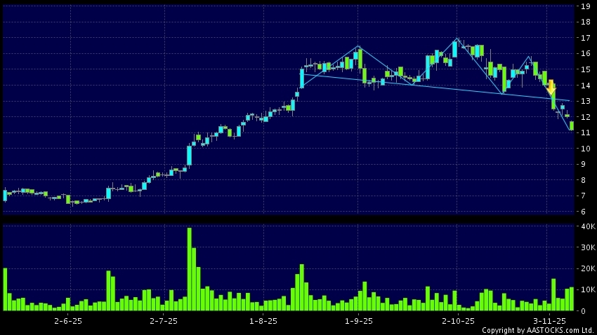丘鈦科技(01478.HK) 0.000 (0.000%) 沽空 $7.11百萬; 比率 10.564% 呈現頭肩頂向下突破。現價報11.140,下跌7.167%,成交量1.12千萬股,成交額1.27億。