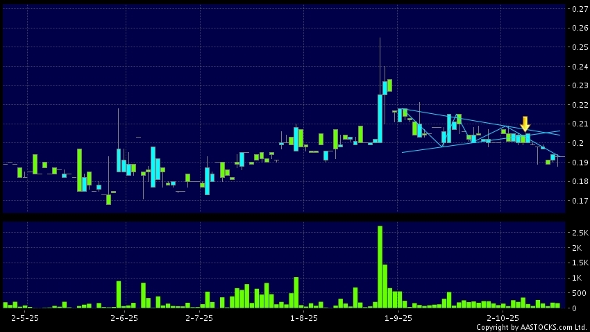 車市科技(01490.HK) +0.030 (+16.760%) 呈現三角形向下突破。現價報0.193,無升跌,成交量0.00股,成交額0.00。