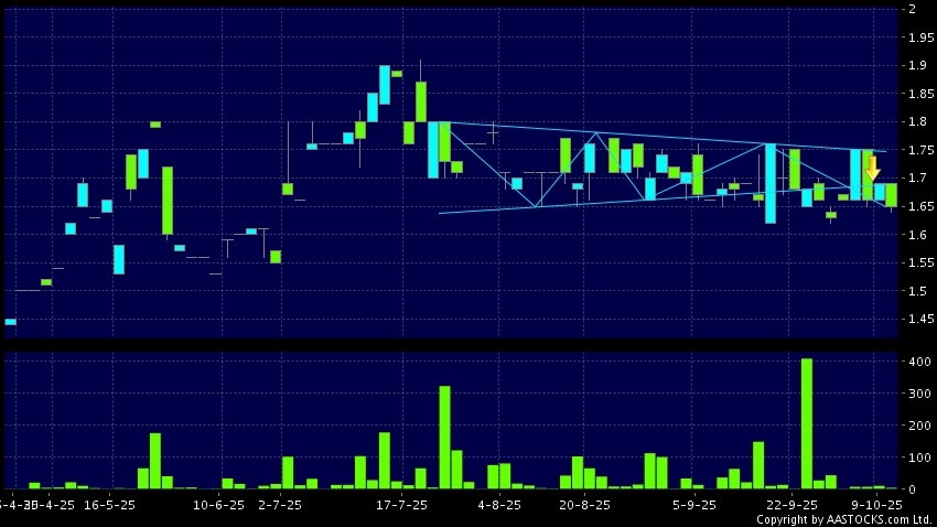 三角形向下突破是指股價的波幅漸漸收窄,在圖表上形成三角形般的狀態。股價在三角形的末端向下突破,下跌趨勢形成,技術走勢偏軟。(港股報價延遲最少十五分鐘。)