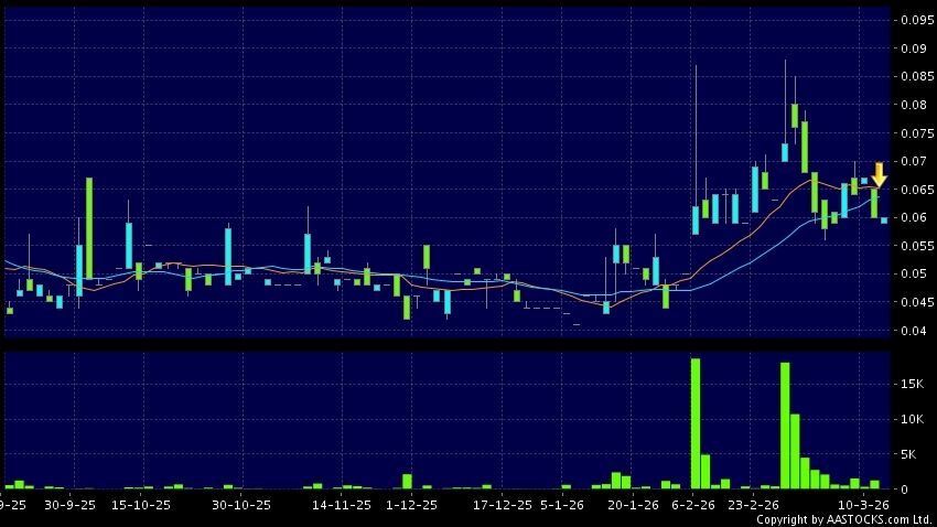 皇庭智家(01575.HK) -0.003 (-4.762%) 10天移動平均線跌穿20天移動平均線,出現死亡交叉。現價報0.060,無升跌,成交量5.00萬股,成交額2.98千。