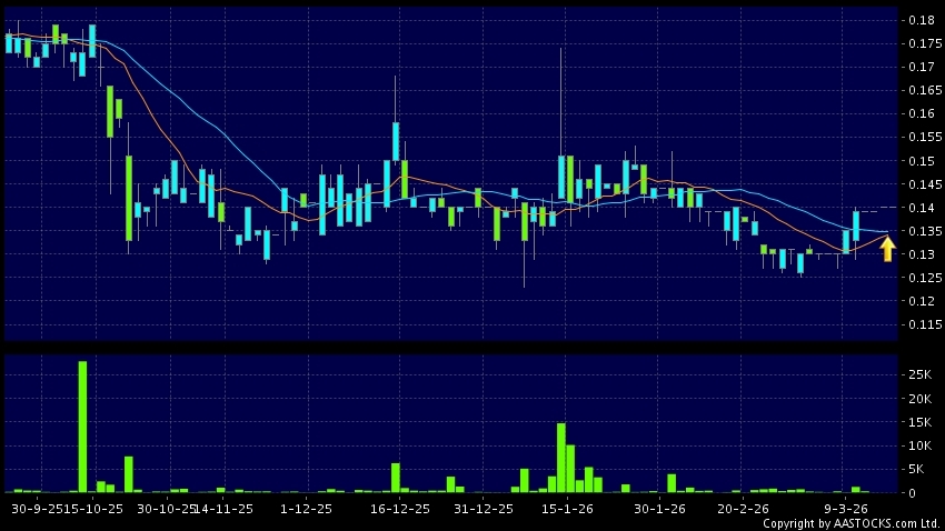汛和集團(01591.HK) 0.000 (0.000%) 10天移動平均線升穿20天移動平均線,出現黃金交叉。現價報0.140,無升跌,成交量6.00千股,成交額738.00。