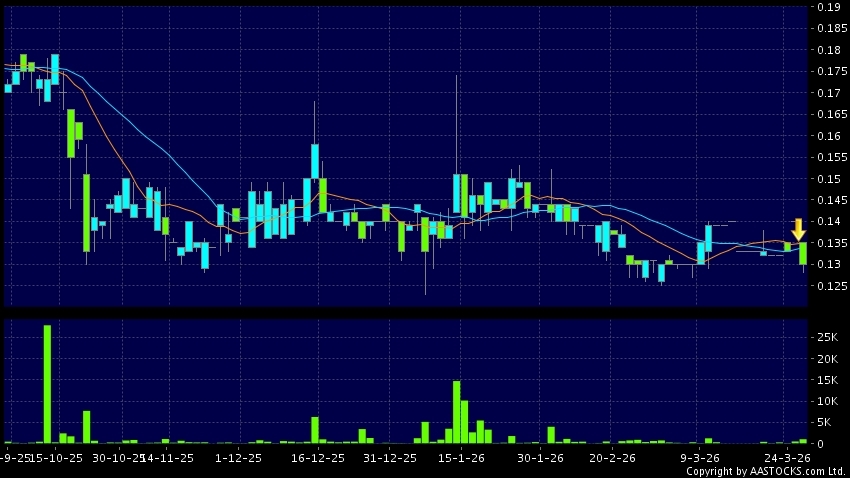 汛和集團(01591.HK) 0.000 (0.000%) 10天移動平均線跌穿20天移動平均線,出現死亡交叉。現價報0.130,下跌7.143%,成交量1.02百萬股,成交額13.33萬。