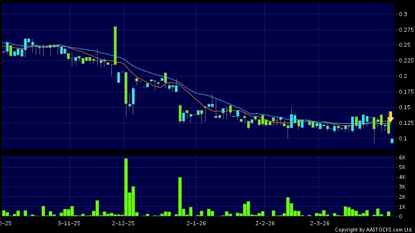 偉能集團(01608.HK) 0.000 (0.000%) 10天移動平均線跌穿20天移動平均線,出現死亡交叉。現價報0.100,下跌7.407%,成交量3.30萬股,成交額3.14千。