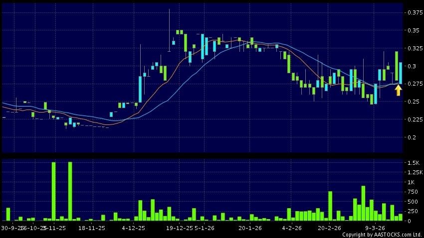 奧邦建築(01615.HK) +0.015 (+5.455%) 10天移動平均線升穿20天移動平均線,出現黃金交叉。現價報0.305,上升8.929%,成交量18.00萬股,成交額5.15萬。