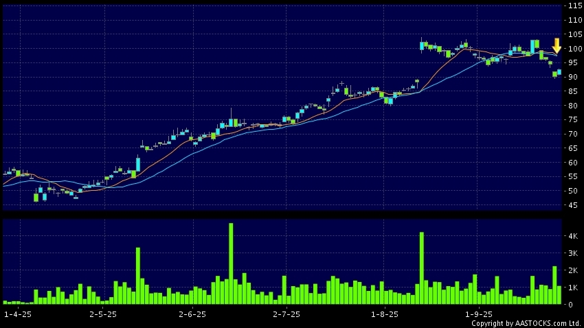 騰訊音樂-SW(01698.HK) 0.000 (0.000%) 沽空 $2.25百萬; 比率 2.949% 10天移動平均線跌穿20天移動平均線,出現死亡交叉。現價報92.600,上升2.604%,成交量1.08百萬股,成交額9.87千萬。