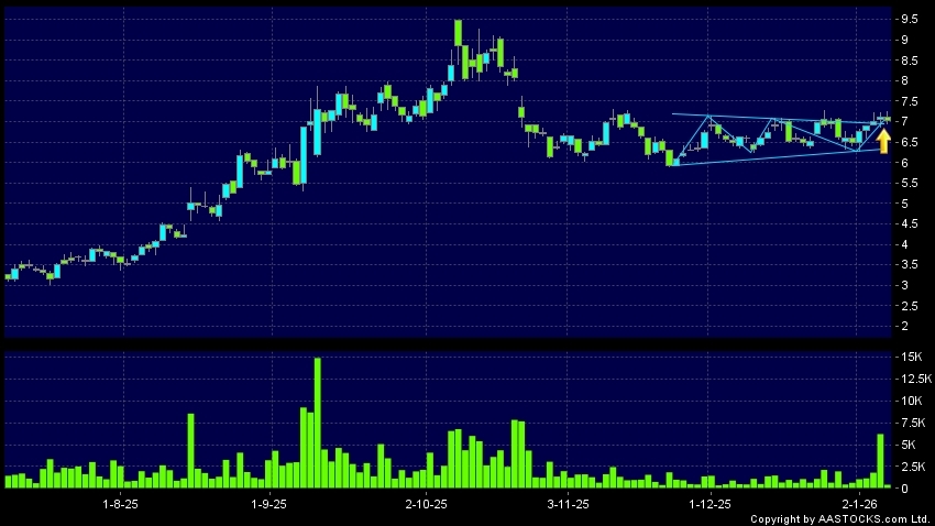 龍資源(01712.HK) +3.540 (+45.677%) 呈現三角形向上突破。現價報7.030,下跌0.986%,成交量42.20萬股,成交額2.99百萬。