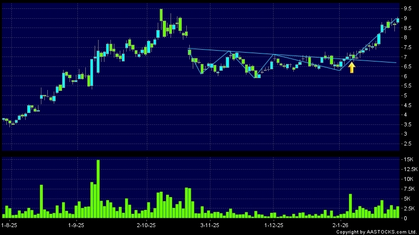龍資源(01712.HK) +3.540 (+45.677%) 呈現頭肩底向上突破,股價升穿頸線。現價報8.990,上升3.931%,成交量3.05百萬股,成交額2.71千萬。