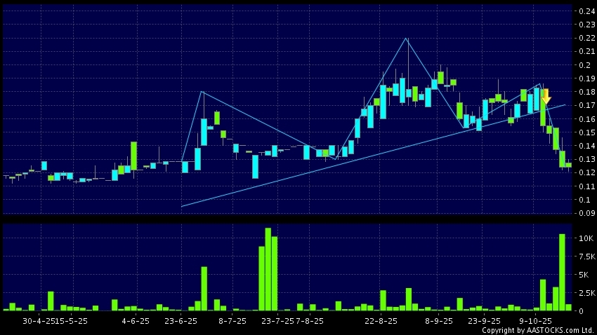 中木國際(01822.HK) -0.003 (-2.128%) 呈現頭肩頂向下突破。現價報0.124,無升跌,成交量90.94萬股,成交額11.47萬。