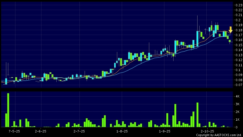 STERLING GP(01825.HK) -0.008 (-5.755%) 10天移動平均線跌穿20天移動平均線,出現死亡交叉。現價報0.156,無升跌,成交量0.00股,成交額0.00。