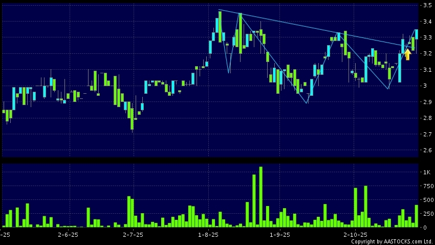 德視佳(01846.HK) -0.010 (-0.313%) 呈現頭肩底向上突破,股價升穿頸線。現價報3.350,上升4.037%,成交量40.50萬股,成交額1.32百萬。