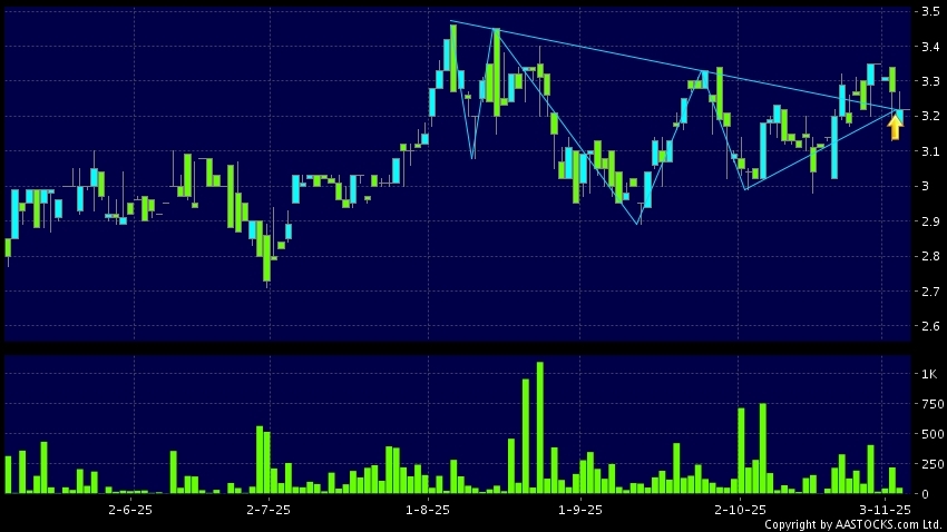 德視佳(01846.HK) -0.010 (-0.313%) 呈現頭肩底向上突破,股價升穿頸線。現價報3.220,無升跌,成交量0.00股,成交額0.00。