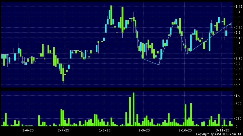 德視佳(01846.HK) -0.010 (-0.313%) 呈現杯柄形向上突破。現價報3.290,上升0.305%,成交量6.80萬股,成交額22.41萬。