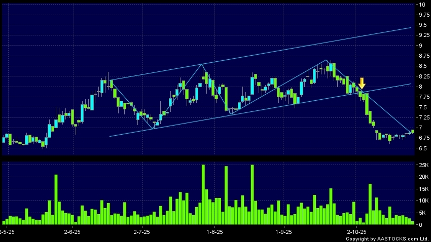 區域突破指股價在過去的一段時間只在一個範圍在內活動,然後股價下跌作出突破,跌穿區域的底部,技術走勢偏軟。(港股報價延遲最少十五分鐘。沽空資料截至 2025-10-28 16:25。)