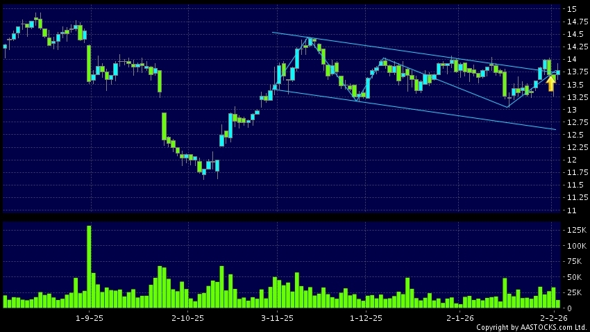 區域突破指股價在過去的一段時間只在一個範圍在內活動,然後股價上升作出突破,升穿區域的頂部,技術走勢向好。(港股報價延遲最少十五分鐘。沽空資料截至 2026-02-25 16:25。)