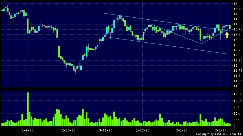 區域突破指股價在過去的一段時間只在一個範圍在內活動,然後股價上升作出突破,升穿區域的頂部,技術走勢向好。(港股報價延遲最少十五分鐘。沽空資料截至 2026-02-25 16:25。)