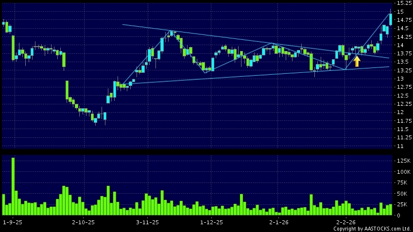 三角形向上突破是指股價的波幅漸漸收窄,在圖表上形成三角形般的狀態。股價在三角形的末端向上突破,形成上升趨勢,技術走勢向好。(港股報價延遲最少十五分鐘。沽空資料截至 2026-02-25 16:25。)