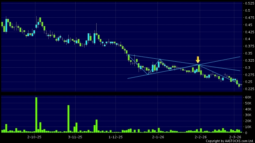 馬可數字科技(01942.HK) -0.007 (-3.256%) 呈現三角形向下突破。現價報0.241,上升3.433%,成交量1.61百萬股,成交額38.25萬。