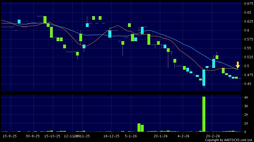 莊臣控股(01955.HK) -0.005 (-1.000%) 10天移動平均線跌穿20天移動平均線,出現死亡交叉。現價報0.465,無升跌,成交量3.00萬股,成交額1.40萬。