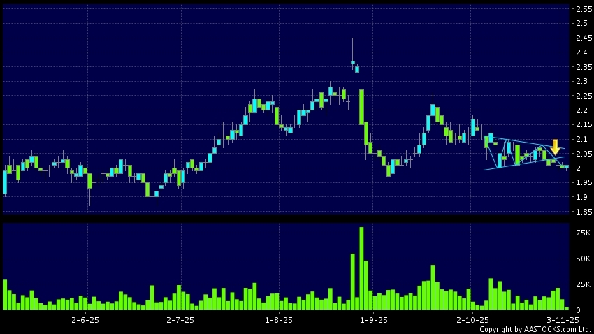 三角形向下突破是指股價的波幅漸漸收窄,在圖表上形成三角形般的狀態。股價在三角形的末端向下突破,下跌趨勢形成,技術走勢偏軟。(港股報價延遲最少十五分鐘。沽空資料截至 2025-11-04 16:25。)