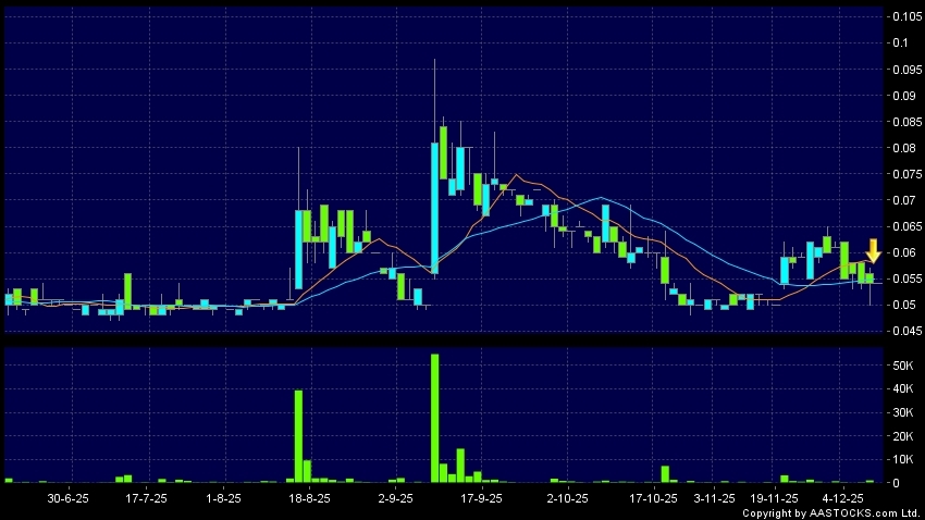 遊萊互動(02022.HK) +0.001 (+1.852%) 10天移動平均線跌穿20天移動平均線,出現死亡交叉。現價報0.054,無升跌,成交量0.00股,成交額0.00。