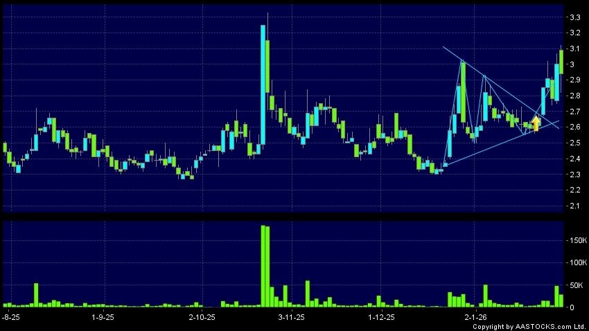 三角形向上突破是指股價的波幅漸漸收窄,在圖表上形成三角形般的狀態。股價在三角形的末端向上突破,形成上升趨勢,技術走勢向好。(港股報價延遲最少十五分鐘。)