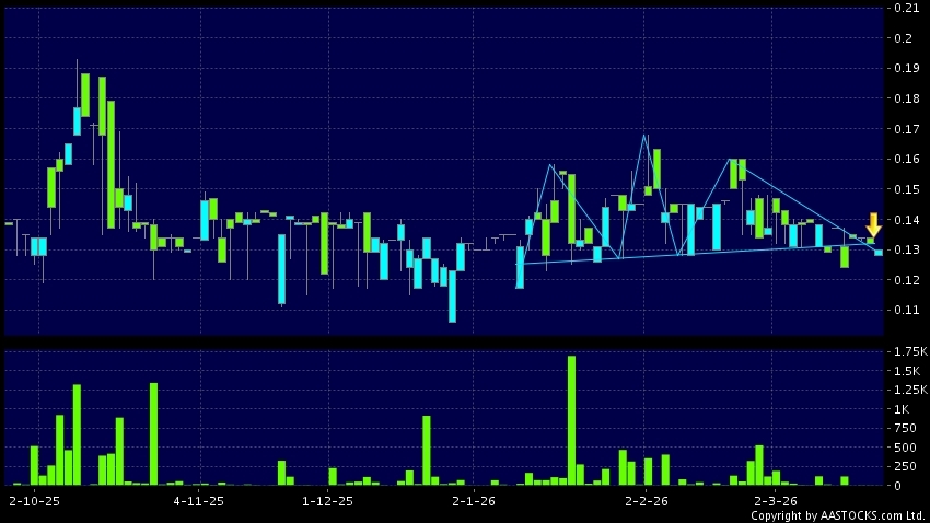 榮陽實業(02078.HK) +0.001 (+0.800%) 呈現頭肩頂向下突破。現價報0.130,無升跌,成交量3.00千股,成交額388.00。