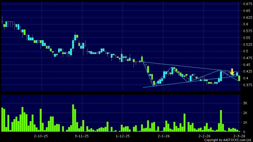 百奧家庭互動(02100.HK) +0.030 (+7.407%) 呈現三角形向下突破。現價報0.390,下跌7.143%,成交量8.00萬股,成交額3.17萬。