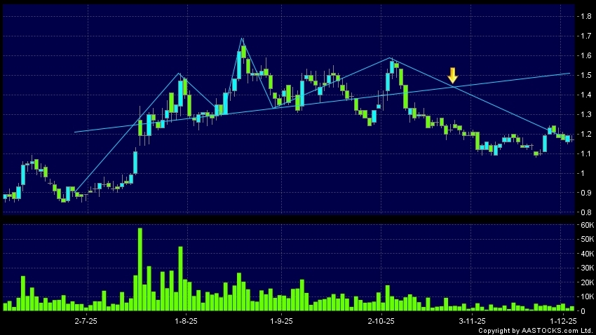 心通醫療-B(02160.HK) 0.000 (0.000%) 沽空 $12.14萬; 比率 10.290% 呈現頭肩頂向下突破。現價報1.170,下跌1.681%,成交量3.39百萬股,成交額3.98百萬。